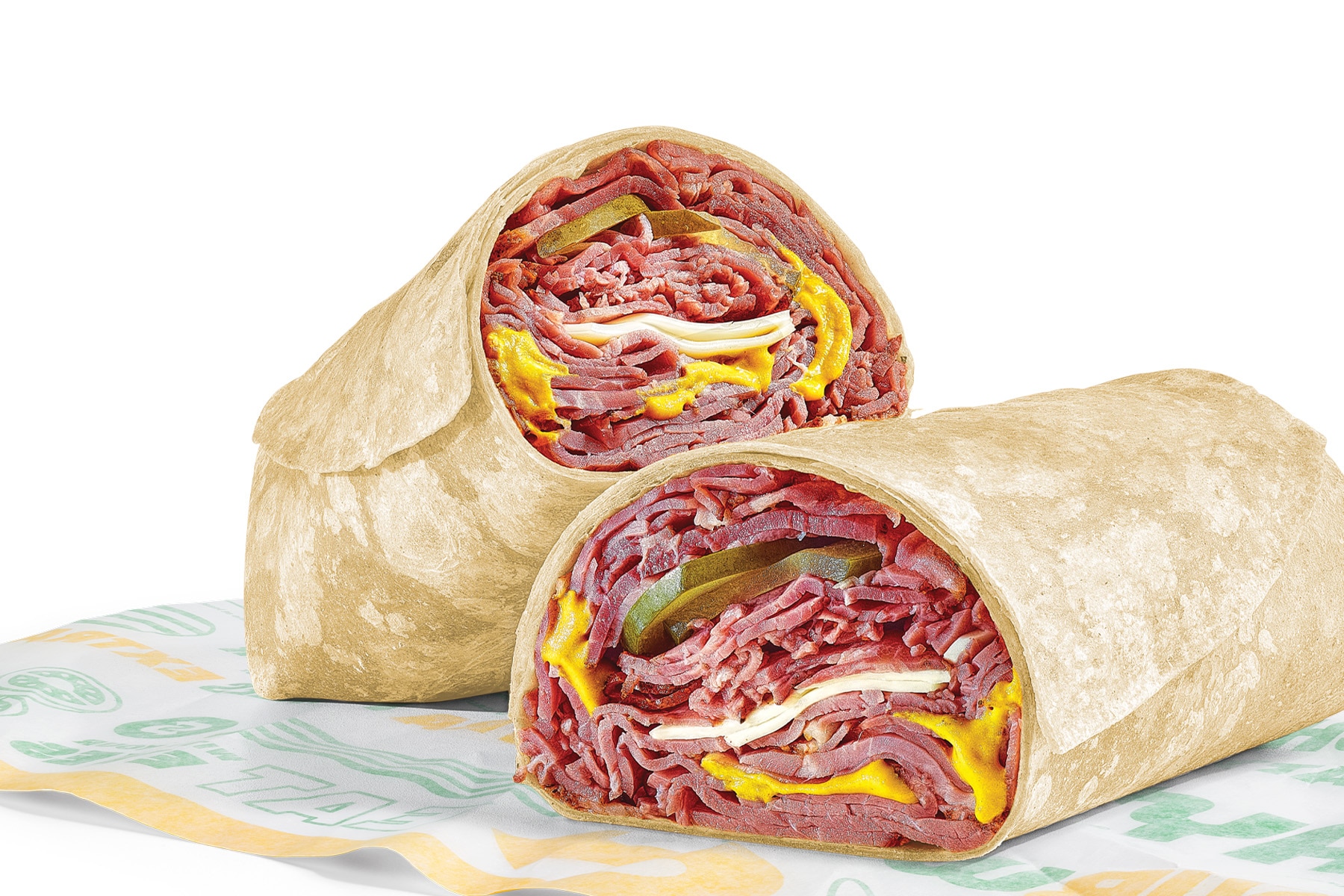 Juicy steak, Cheddar cheese sauce, crisp red onions, green peppers, SubKrunch™ and Roasted Garlic Aioli, wrapped in a flour tortilla.